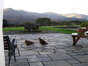 window looking out at the Moelwyn mountain range with a large patio